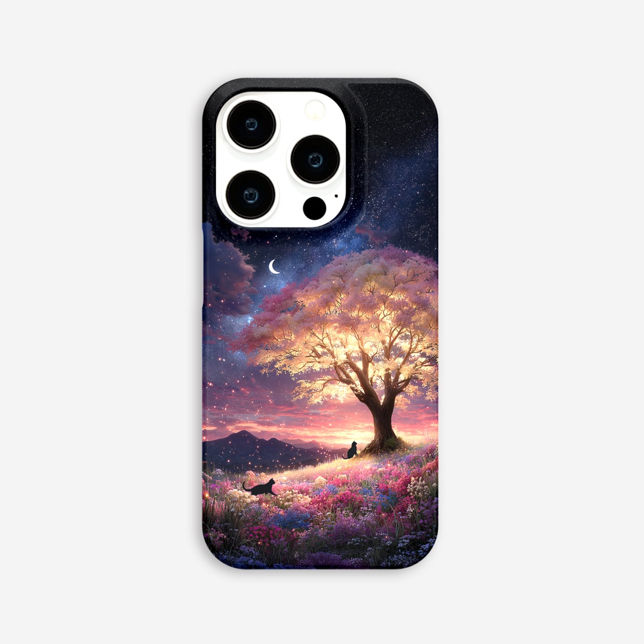 春夜の秘密の通り道 |iPhone17/16/15/14/13 全機種対応 強化ガラス スマホケース 森 桜 三日月 水辺 黒猫 星空