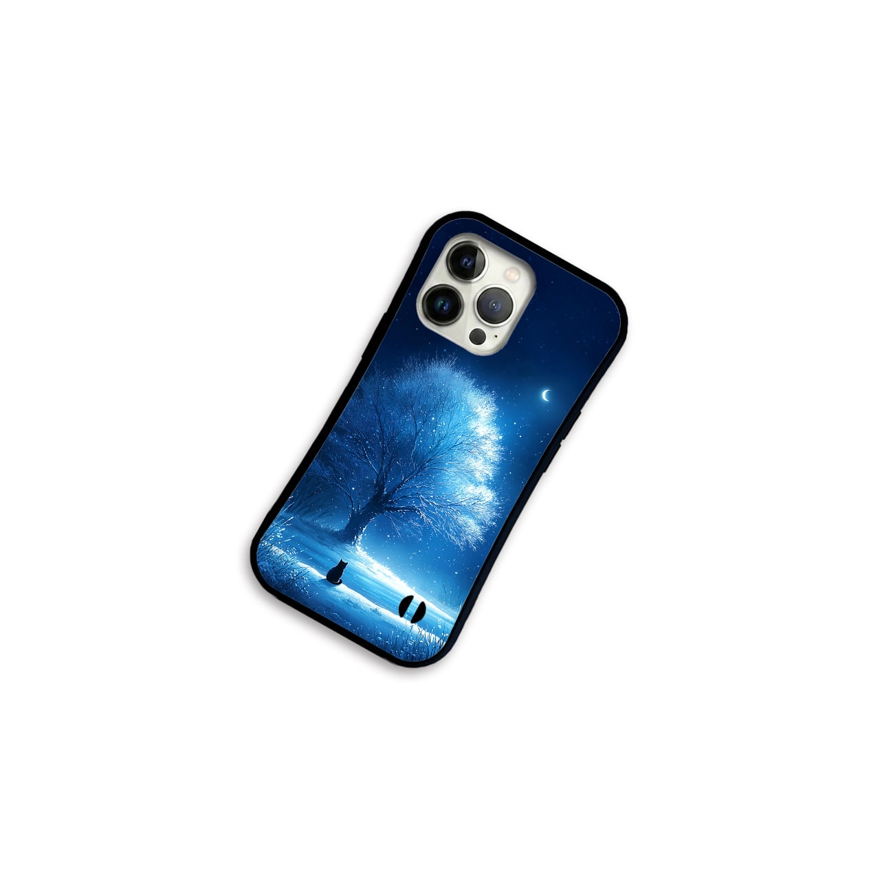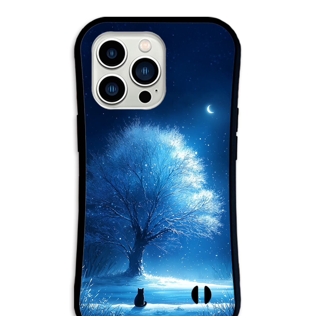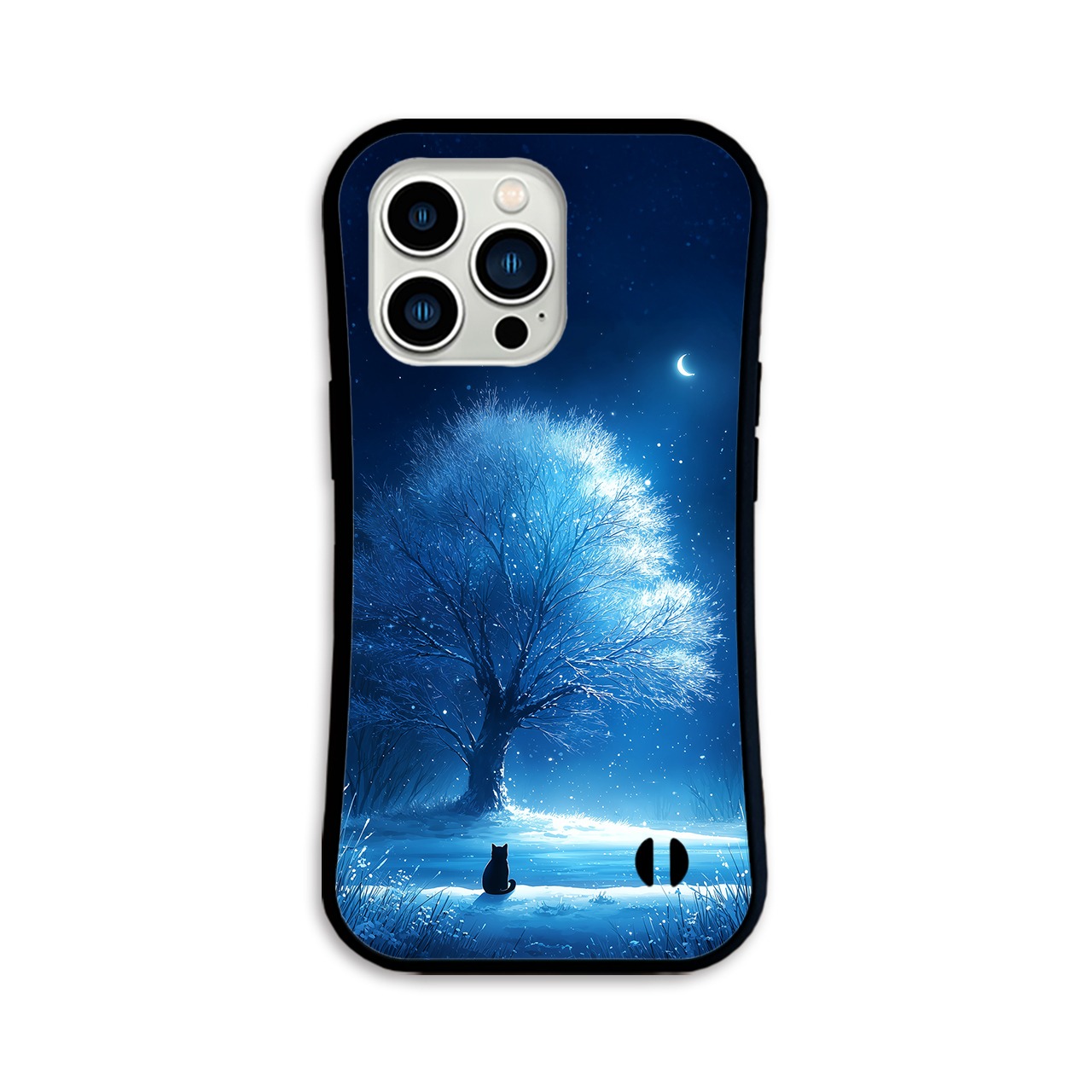 月華の雪樹 iPhone17/16/15対応 グリップケース 耐衝撃 青 黒猫 幻想的 三日月