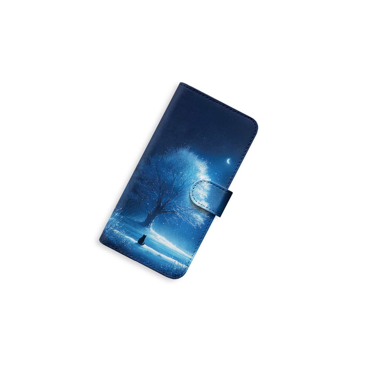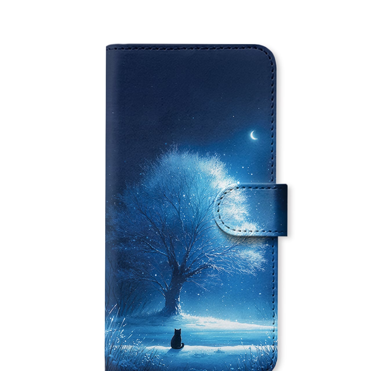 月華の雪樹 手帳型ケース ほぼ全機種対応 はめ込み式 青 黒猫 幻想的 三日月 ねこ 雪景色
