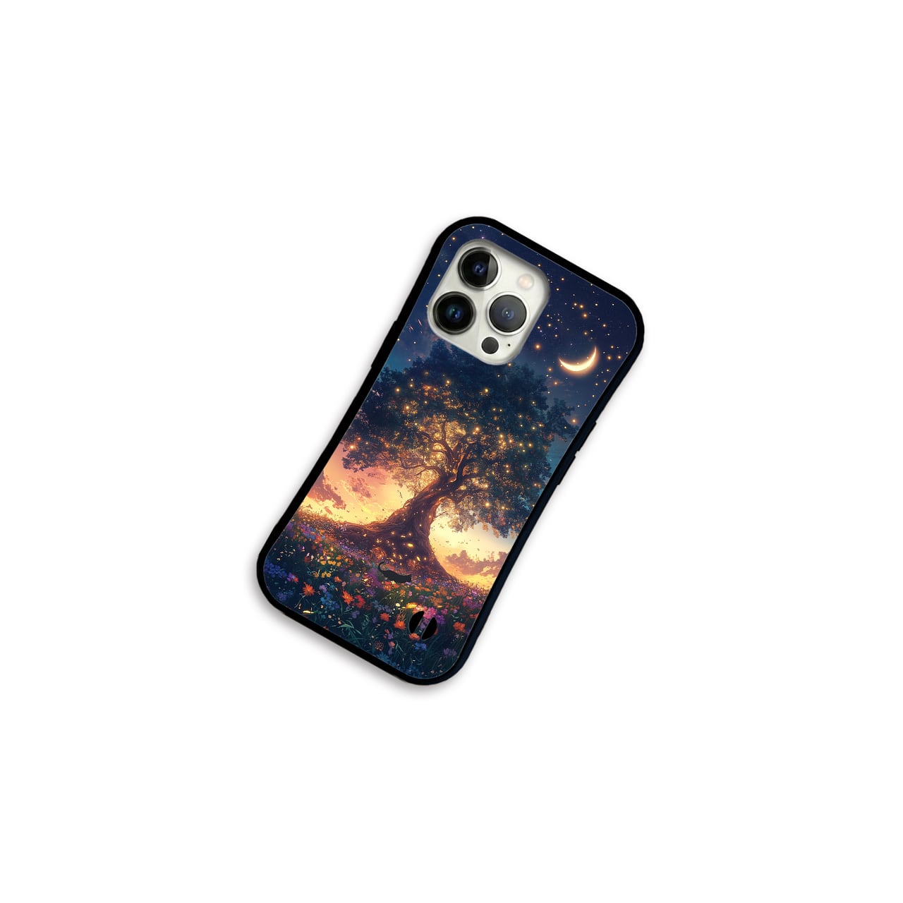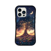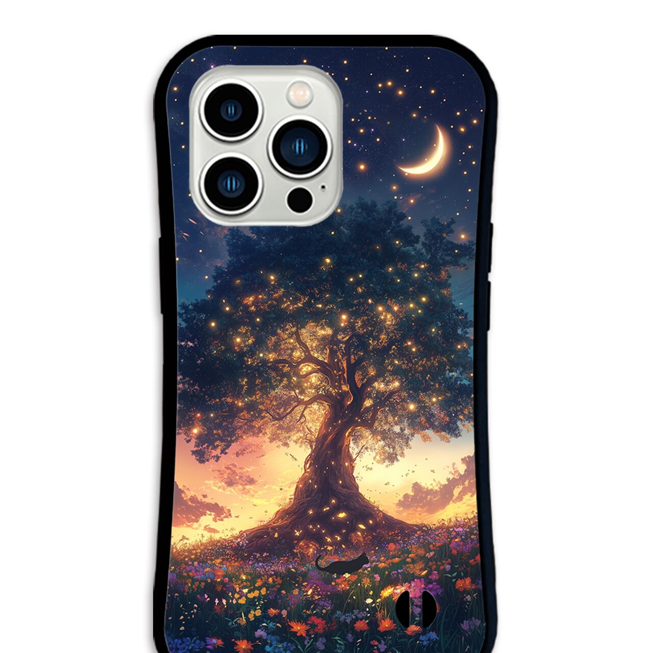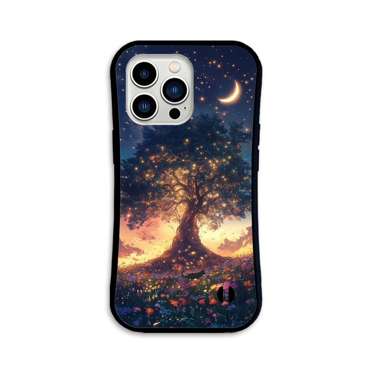 星宿りの大樹 iPhone17/16/15対応 グリップケース iPhoneケース スマホケース 耐衝撃 黒猫 花 三日月 夕焼け