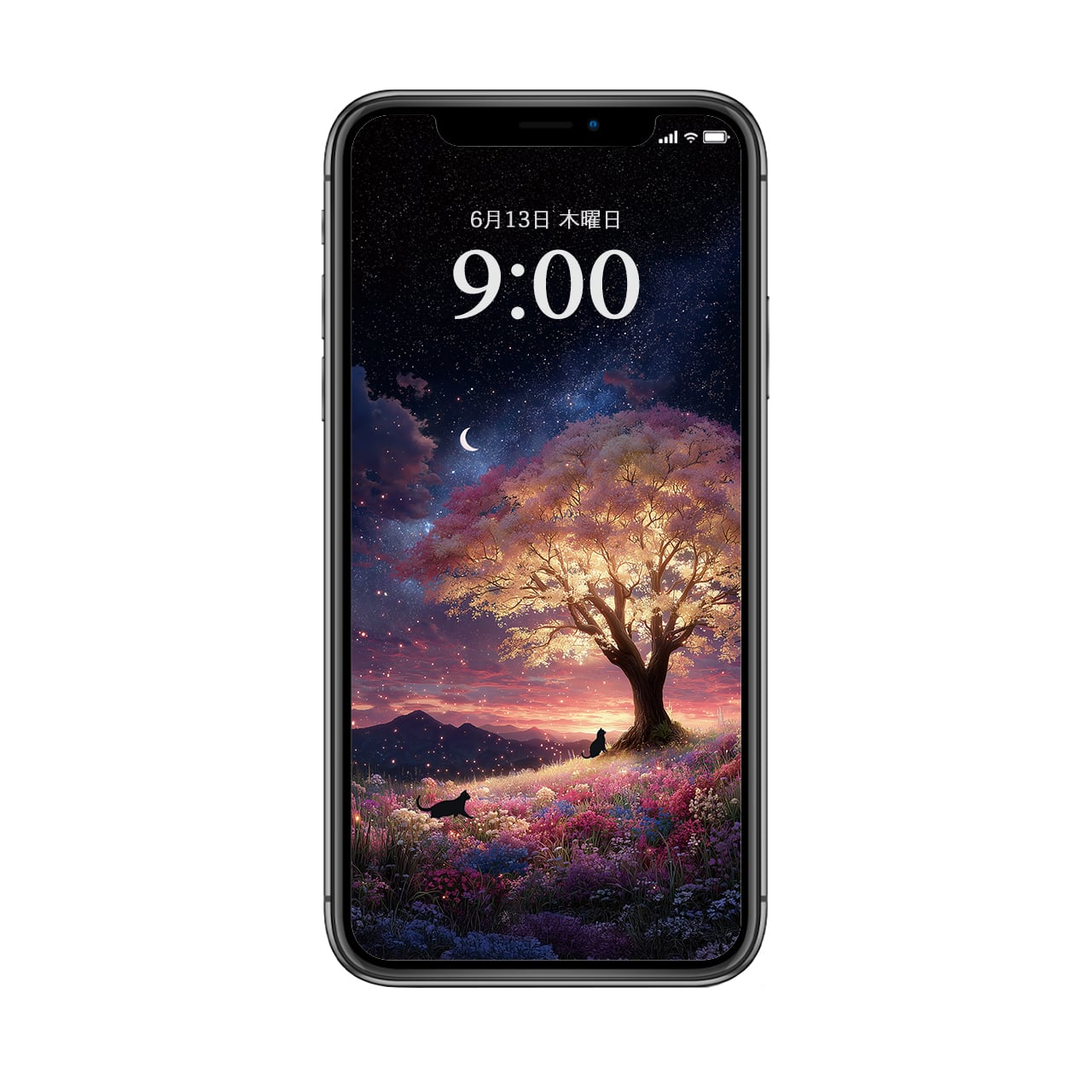 【高画質】桜月夜の約束 壁紙 スマートフォン用 黒猫 幻想的 三日月 春 星空
