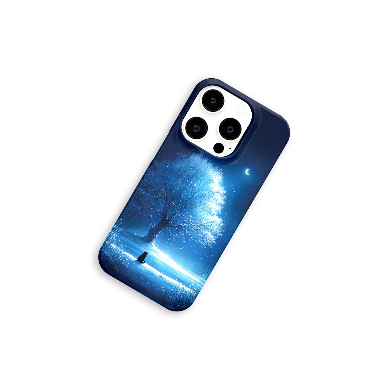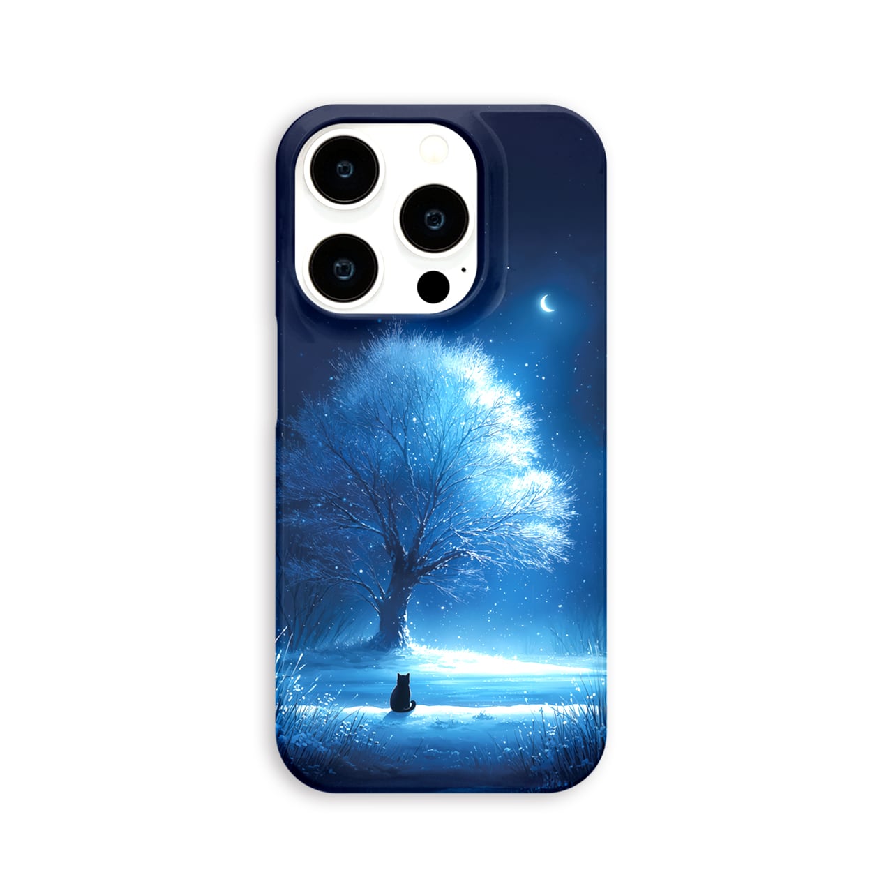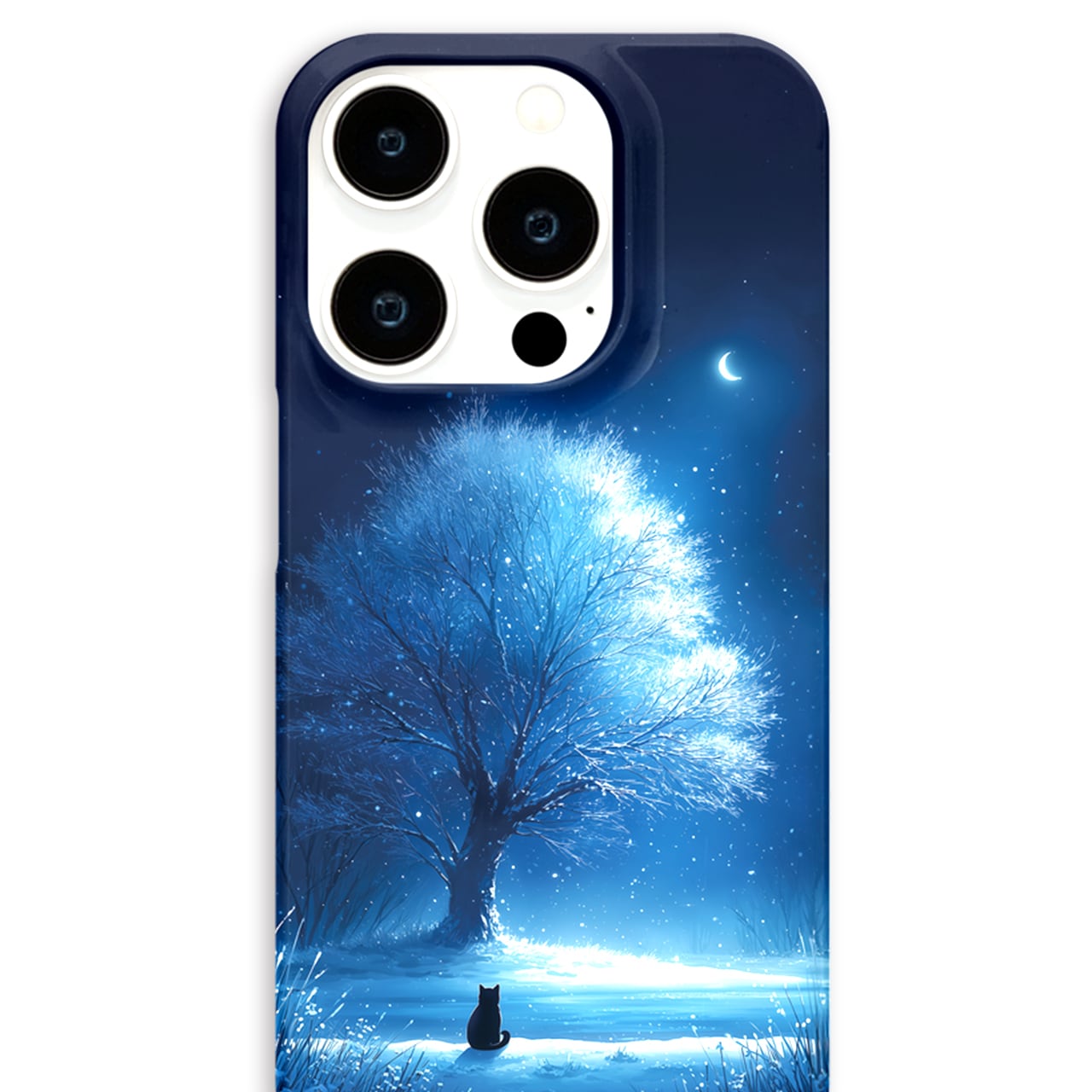 月華の雪樹|iPhone17/16/15/14/13 全機種対応 Android スマホケース 青 黒猫 幻想的 三日月