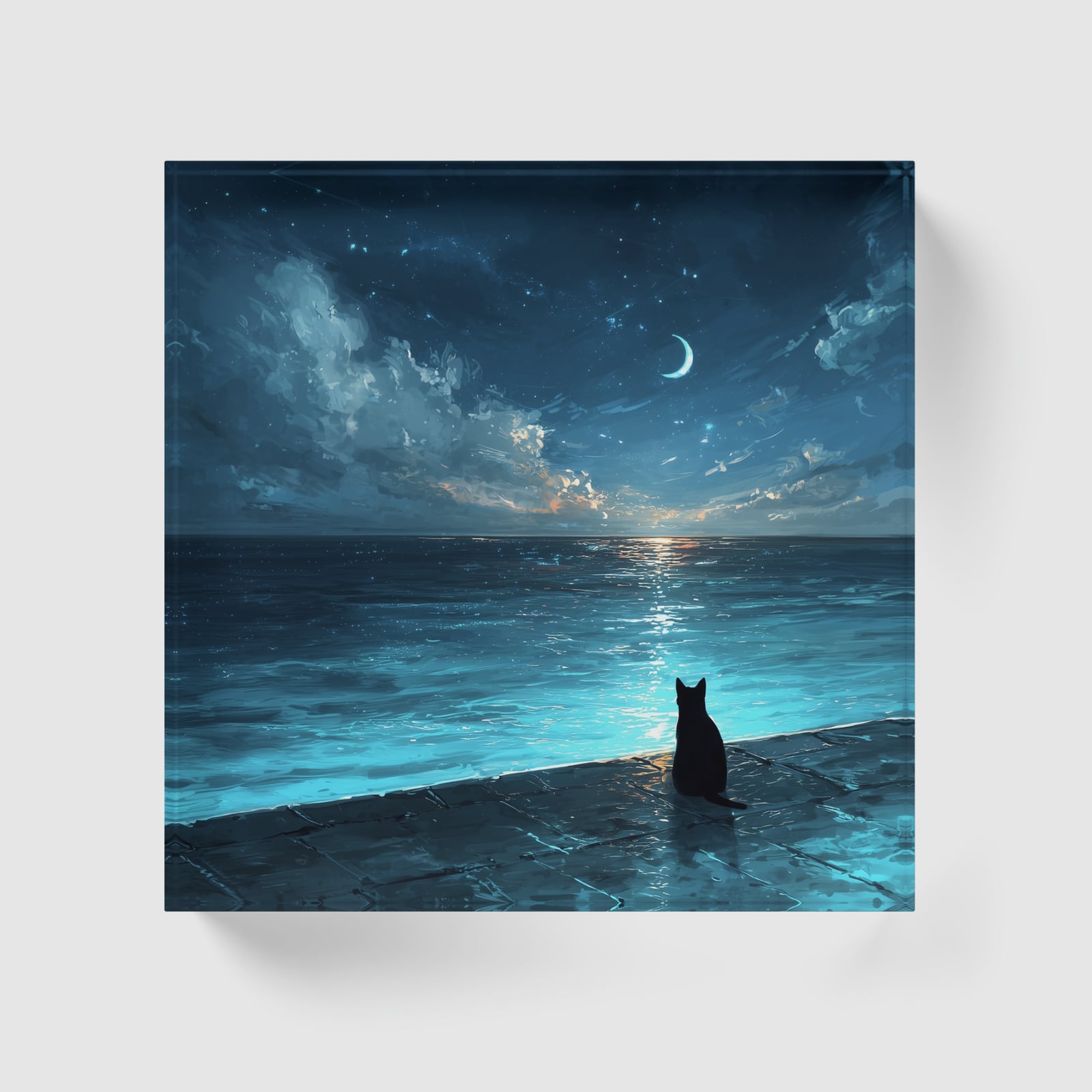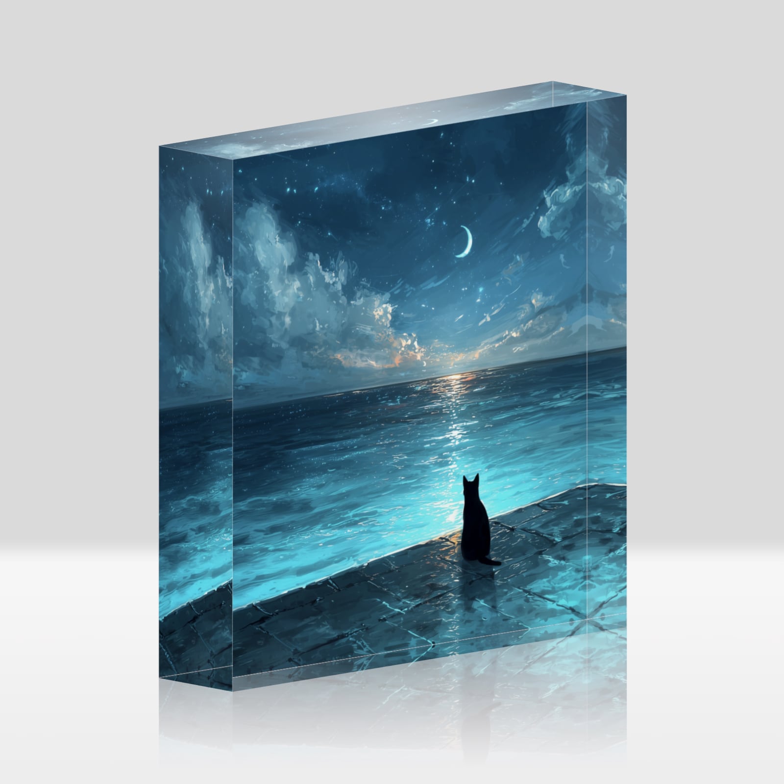 宵の海、星のはじまり | アクリルブロック インテリア 幻想アート ブックスタンド ペーパーウェイト 置物 ギフト 透明感 浄化 厚さ2cm 重厚感 海 海岸 空 黒猫 ねこ 星空 月