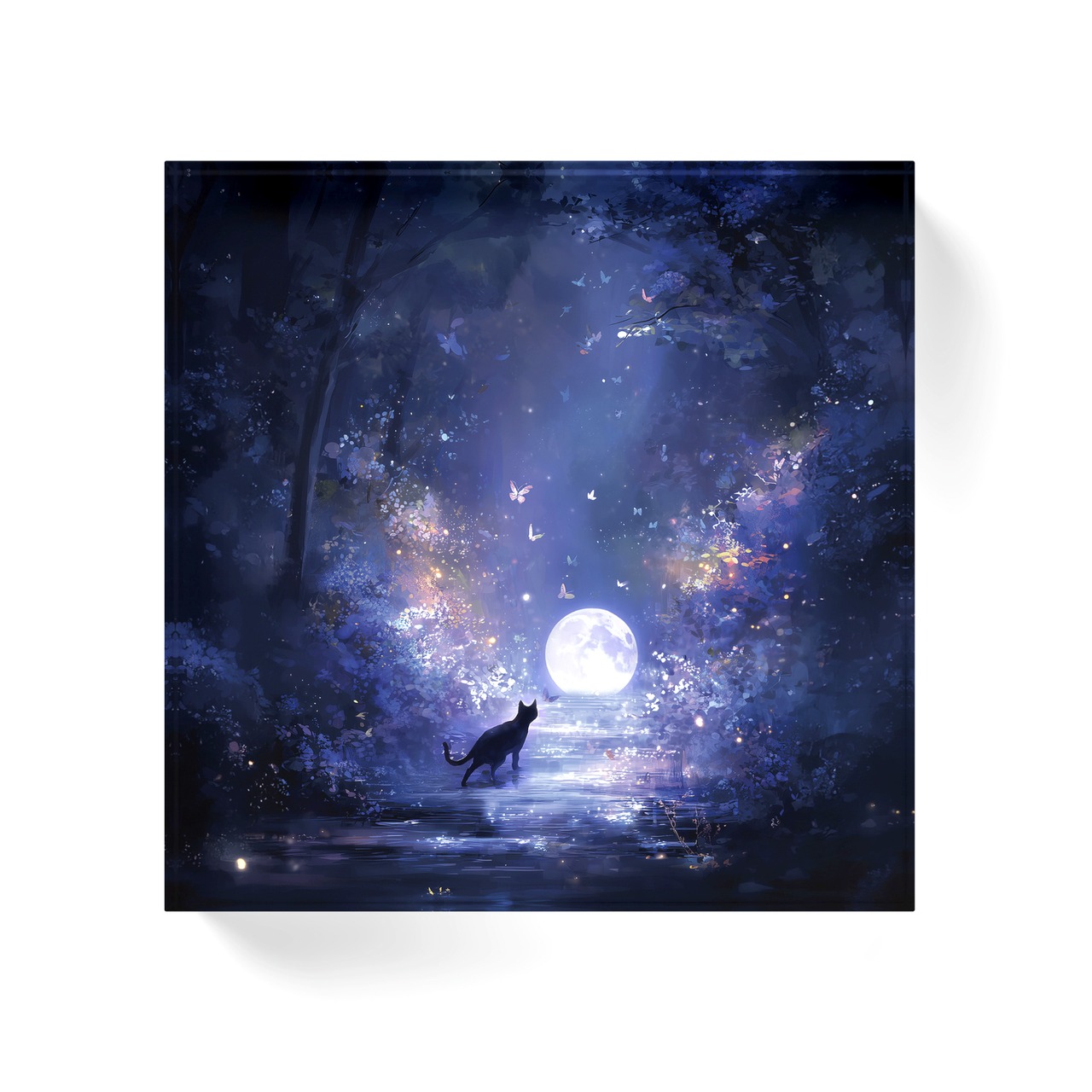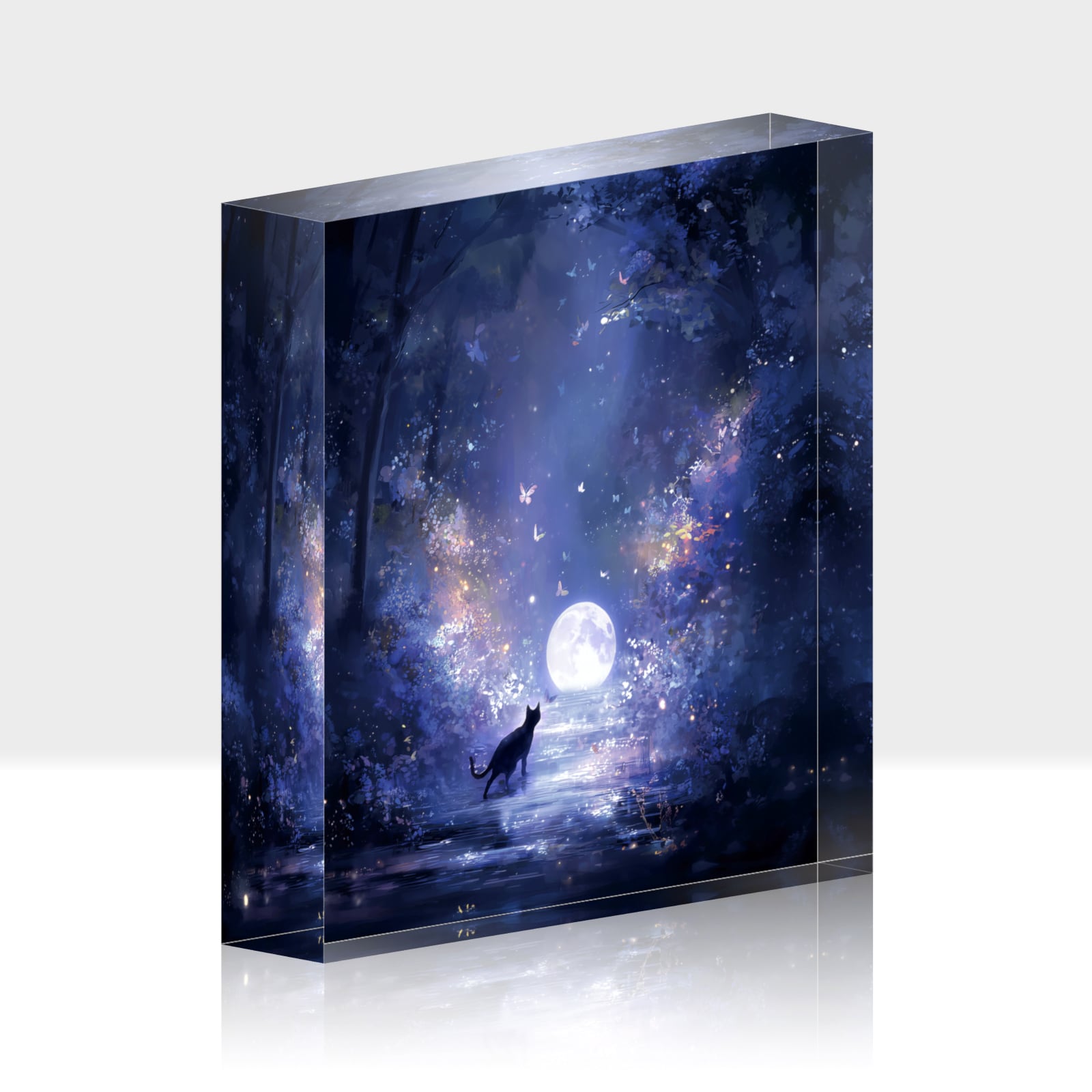夢幻の森 | アクリルブロック インテリア 幻想アート ブックスタンド ペーパーウェイト 置物 ギフト 透明感 浄化 厚さ2cm 重厚感 ねこ 森 蝶々 満月 星