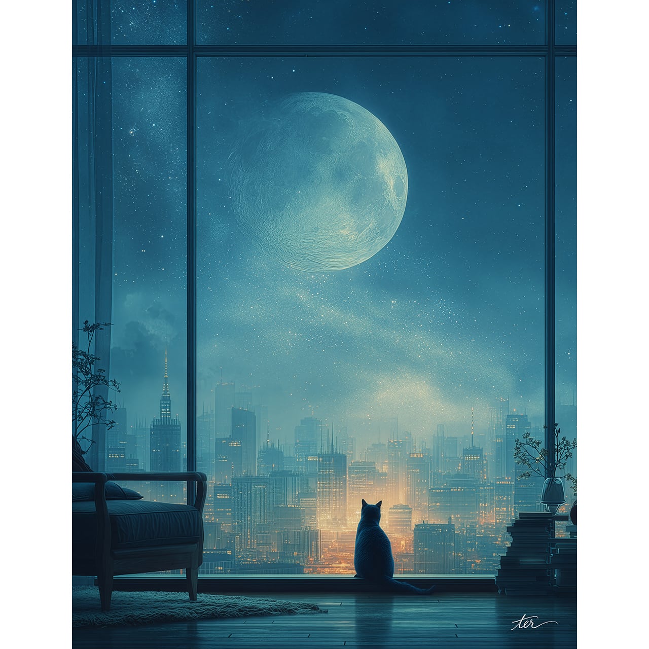 都会の喧騒から離れ、蒼く深い静寂に沈み込むお部屋。神秘的な月光がカウチを照らし、心をフラットな状態へと導きます。何も考えず、ただ夜景と青い月に身を委ねて安らぎたい夜に帰る、あなただけの場所。