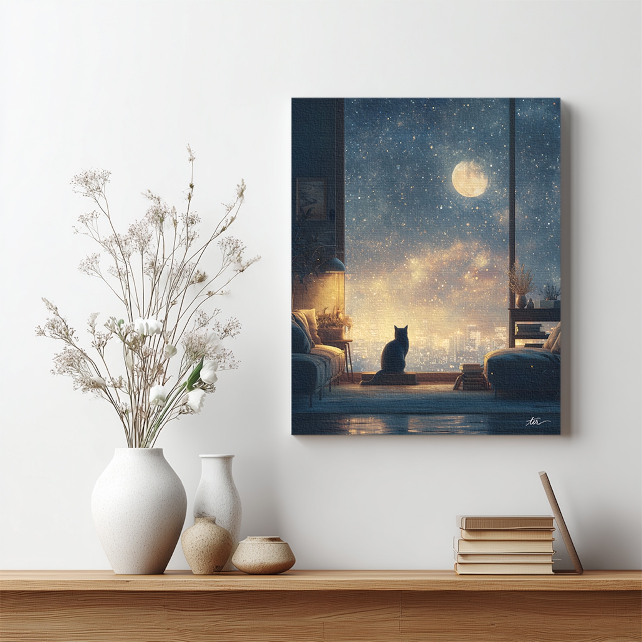 ふと見上げた夜空のような、静かな物語のはじまりを告げるキャンバスアートです。