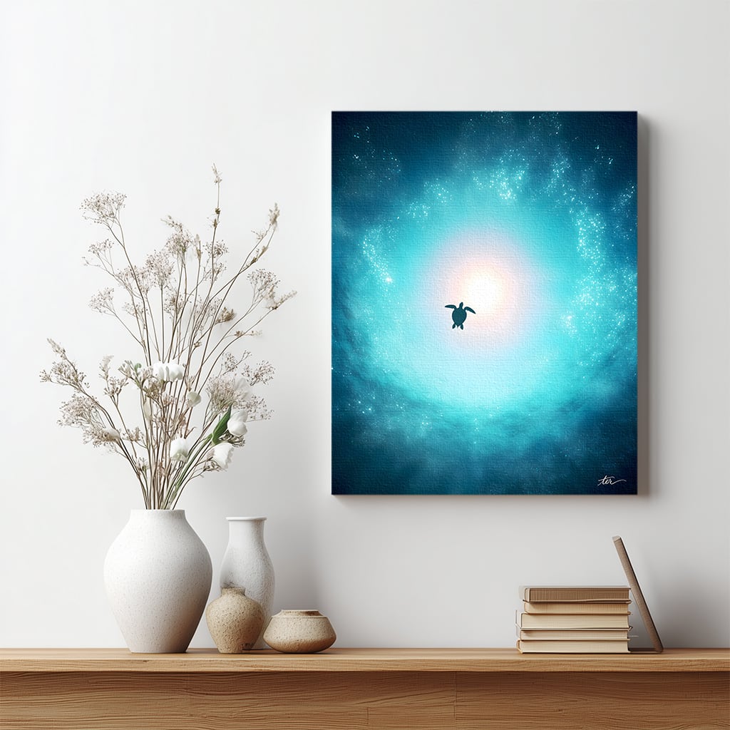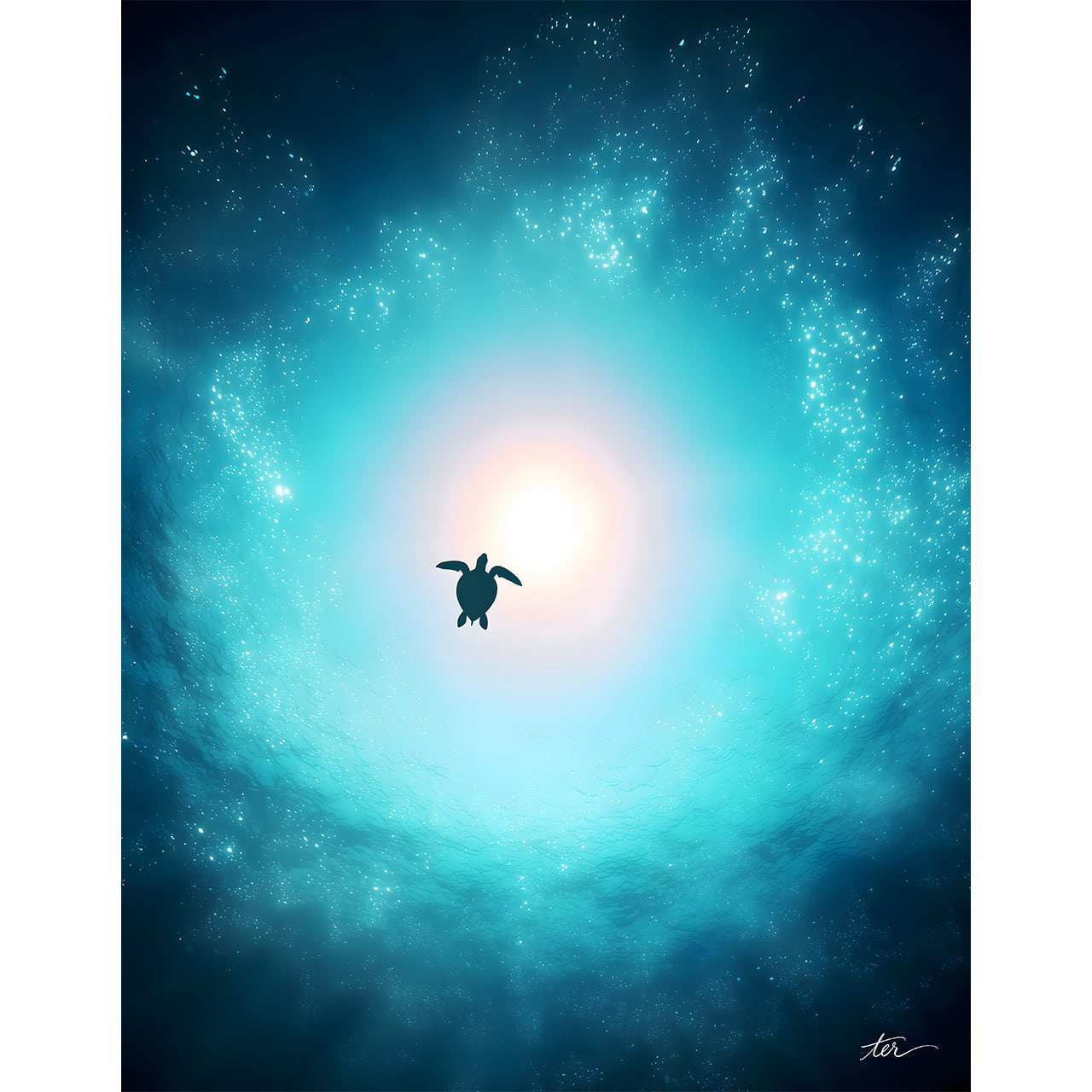 見渡す限りの深い蒼(あお)の中を、光の源へと静かに泳いでいく一匹のウミガメ。