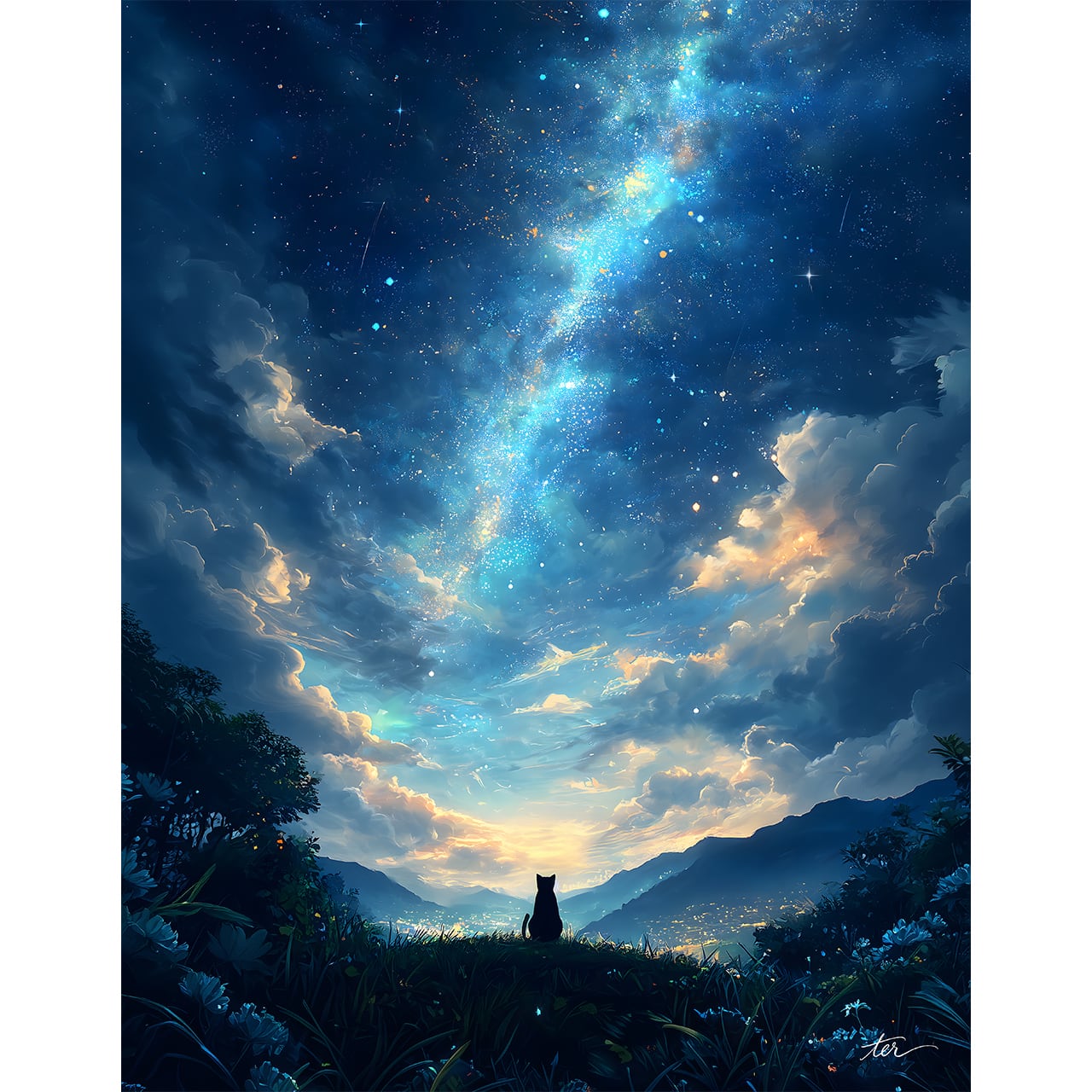 深く吸い込まれそうな「蒼」と、地平線に滲む柔らかな光。その境界線で、静かに明日を見つめる一匹の猫を描きました。