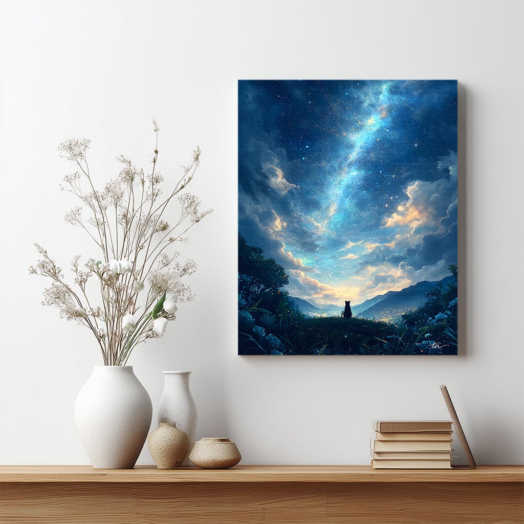 ふと見上げた夜空のような、静かな物語のはじまりを告げるキャンバスアートです。
