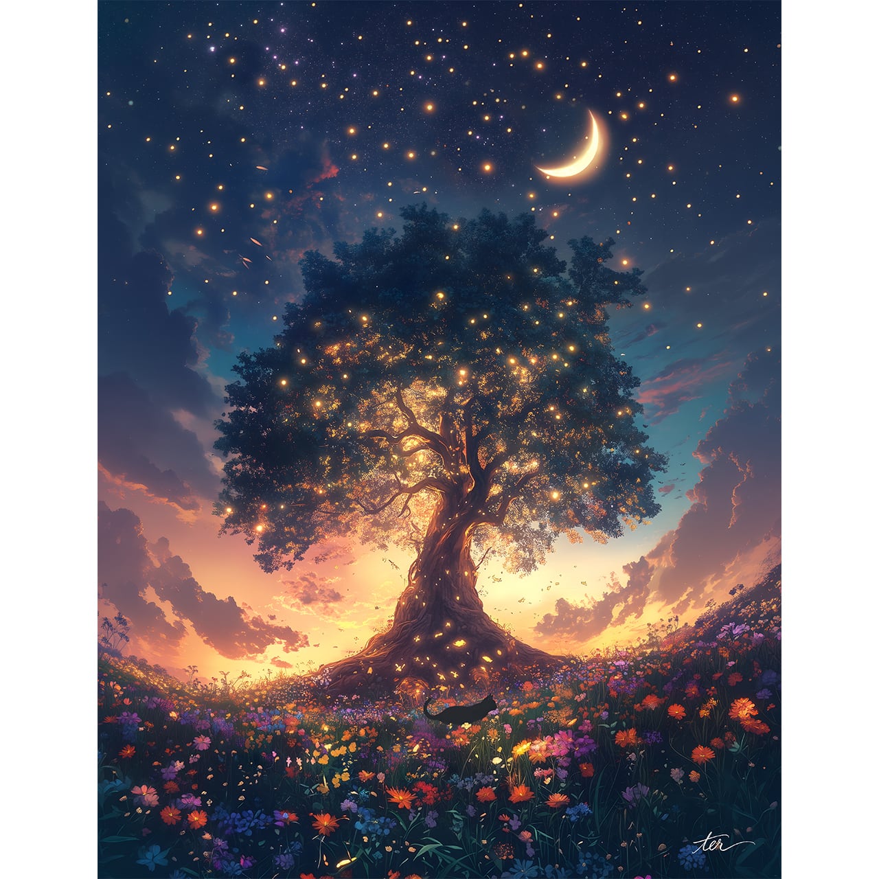 その枝には無数の星々が宿り、足元には色とりどりの花が咲き乱れています。