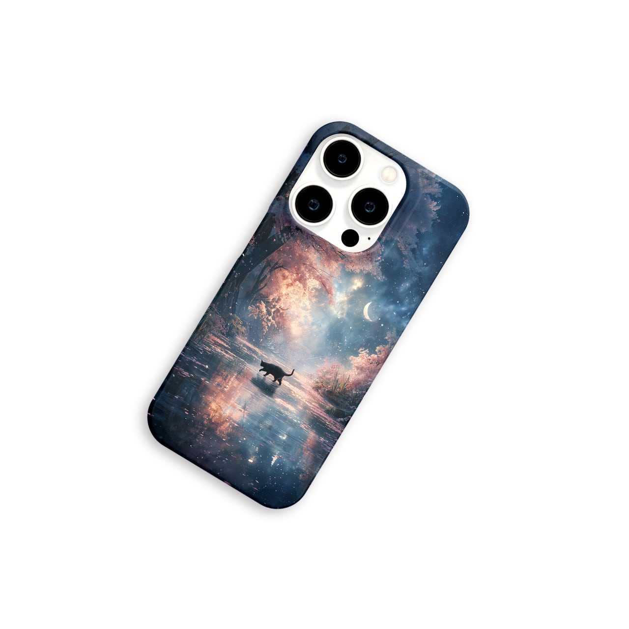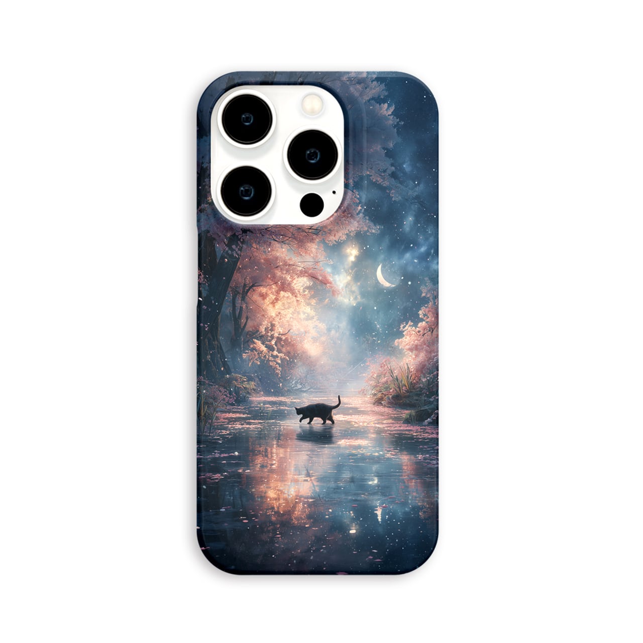 春夜の秘密の通り道 | iPhone17/16/15/14/13 全機種対応 Android スマホケース 森 桜 三日月 水辺 黒猫 星空