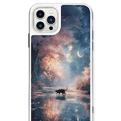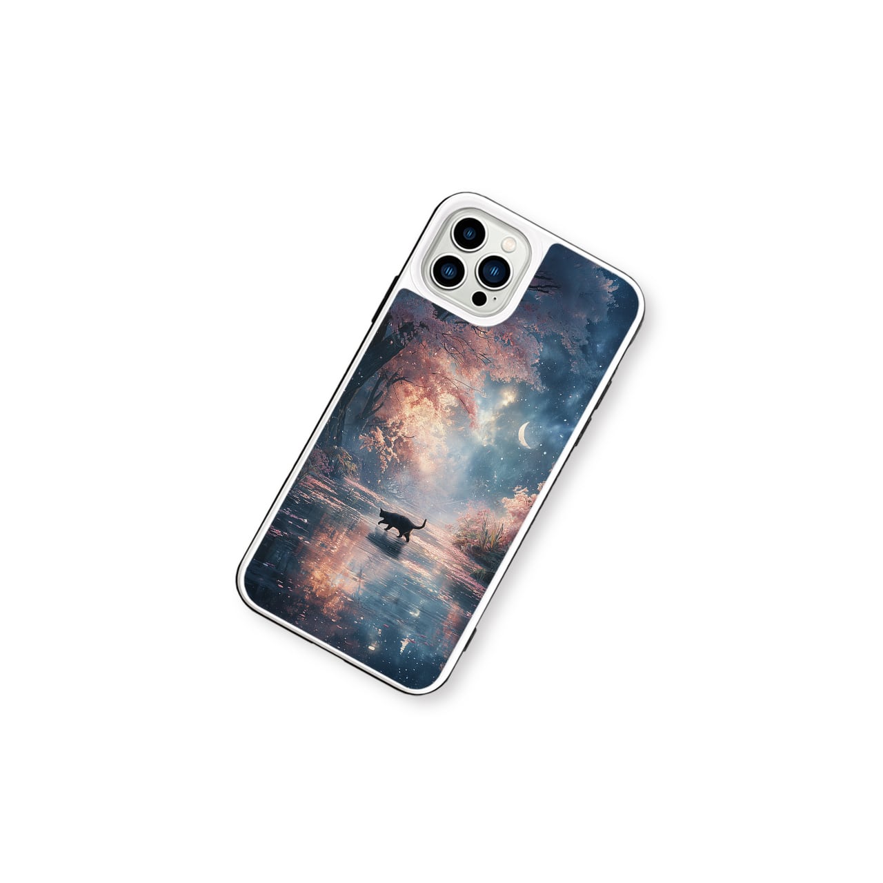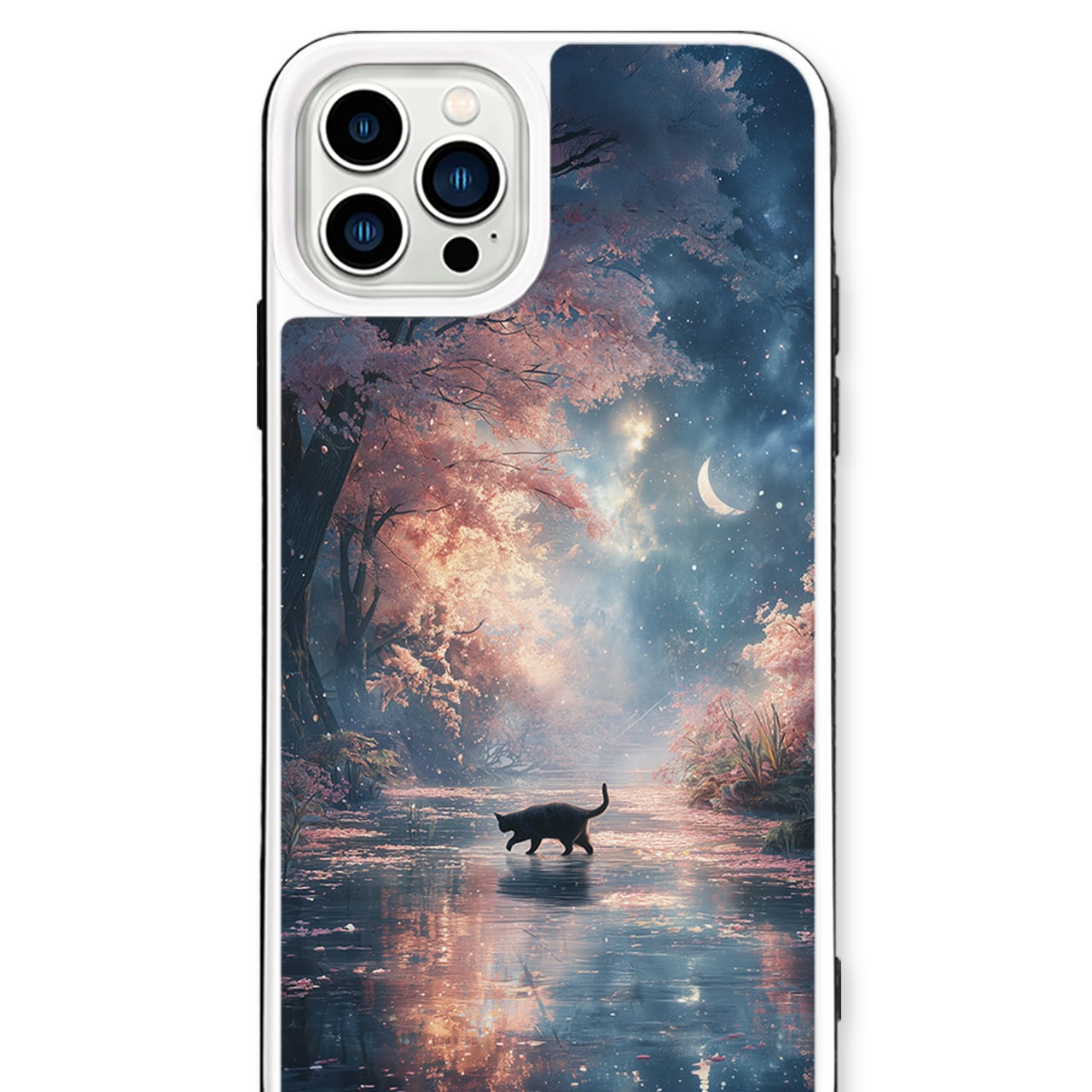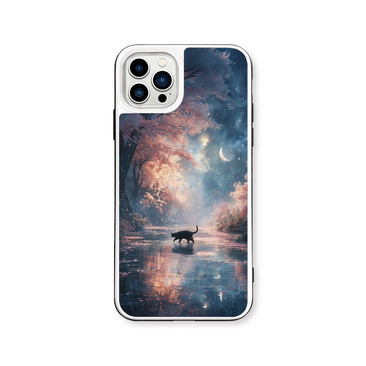 春夜の秘密の通り道 |iPhone17/16/15/14/13 全機種対応 強化ガラス スマホケース 森 桜 三日月 水辺 黒猫 星空