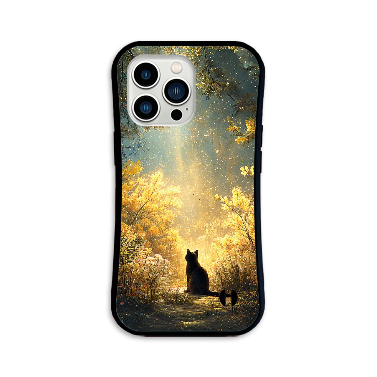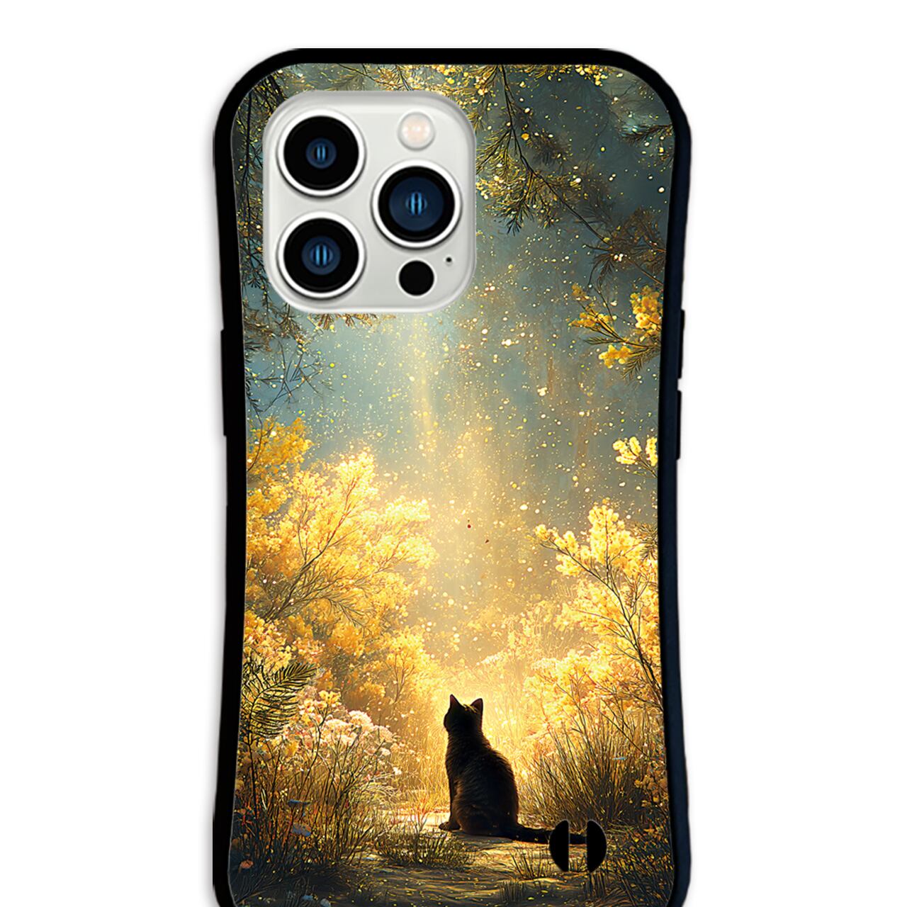 黄金の木漏れ日 | iPhone17/16/15対応 グリップケース iPhoneケース スマホケース 耐衝撃 ミモザ 黒猫 春