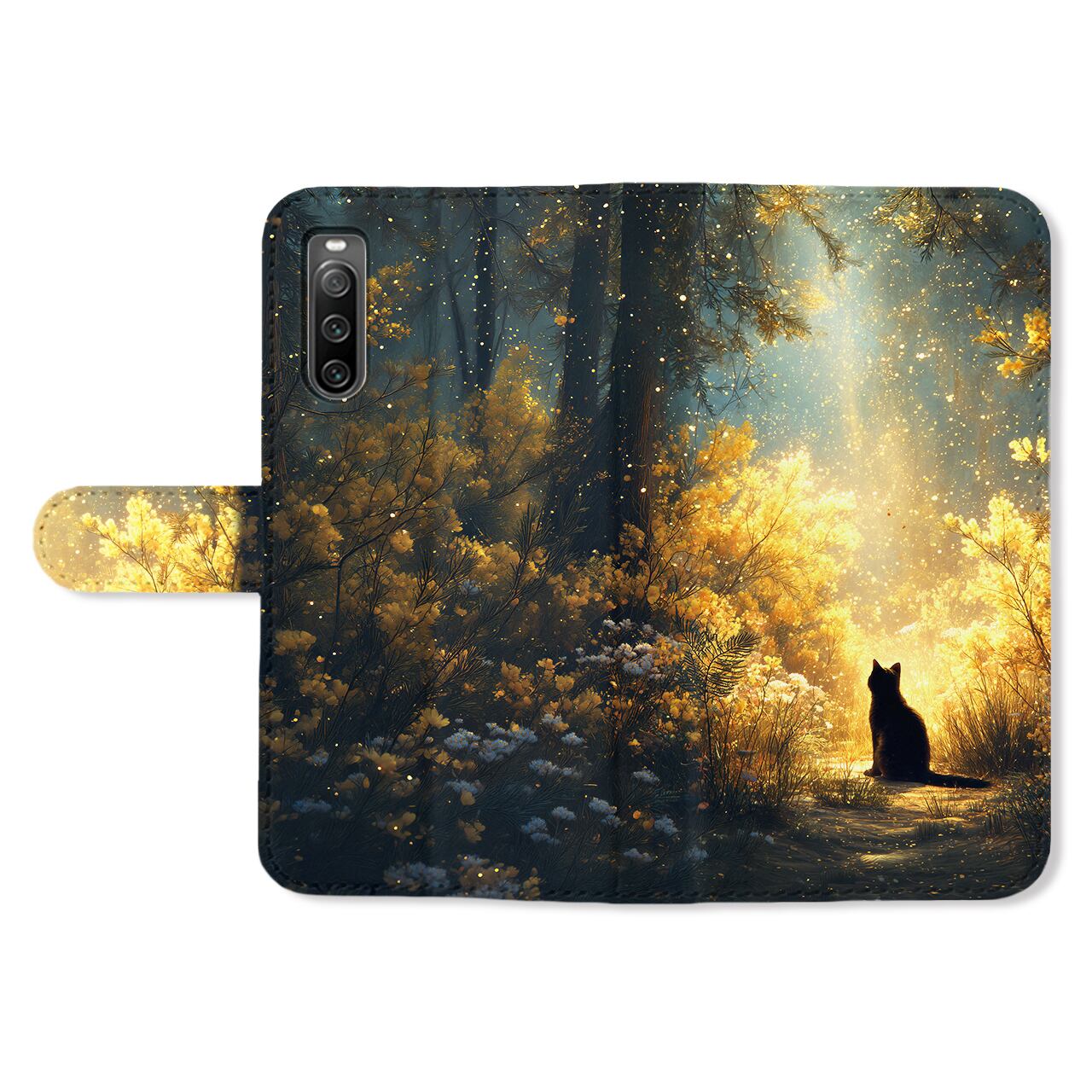 黄金の木漏れ日 | iPhone17/16/15/14/13 全機種対応 Android スマホケース ミモザ 黒猫 春