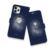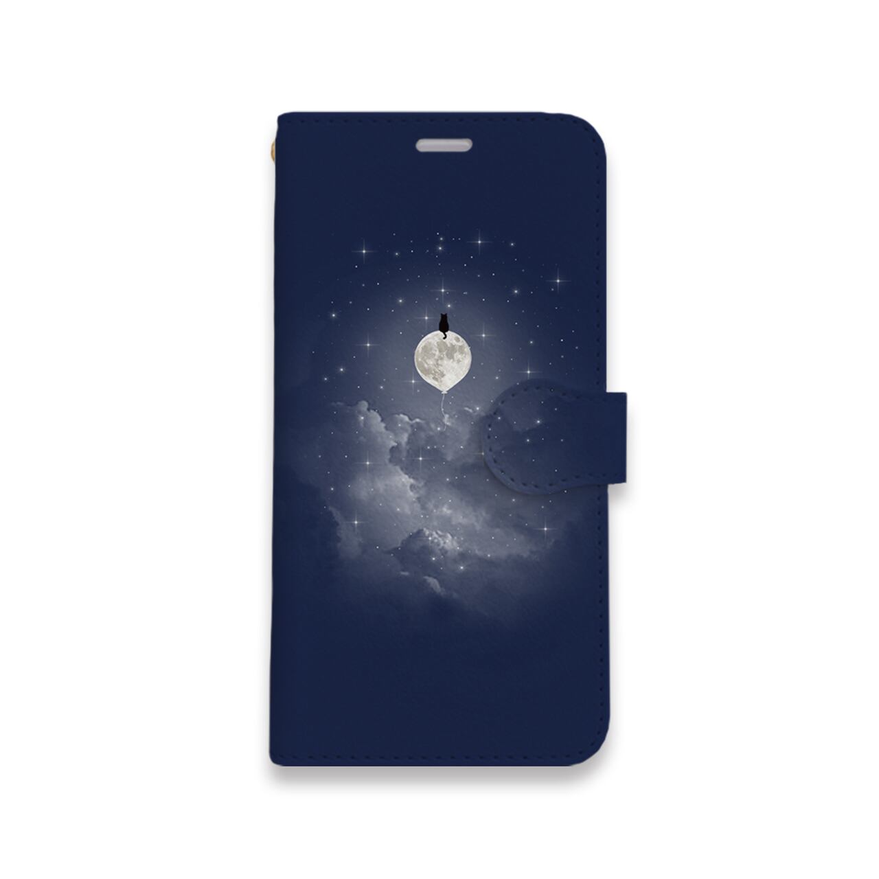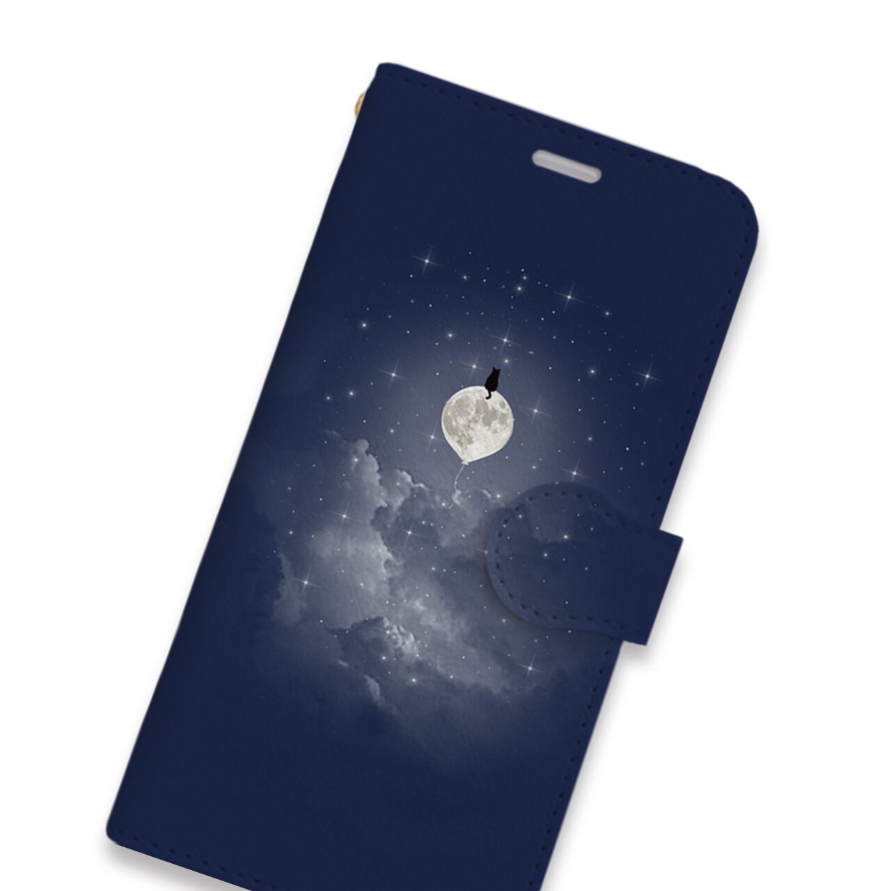 満月の風船で空中遊泳を楽しむ黒猫を幻想的に描いた手帳型ケースです。