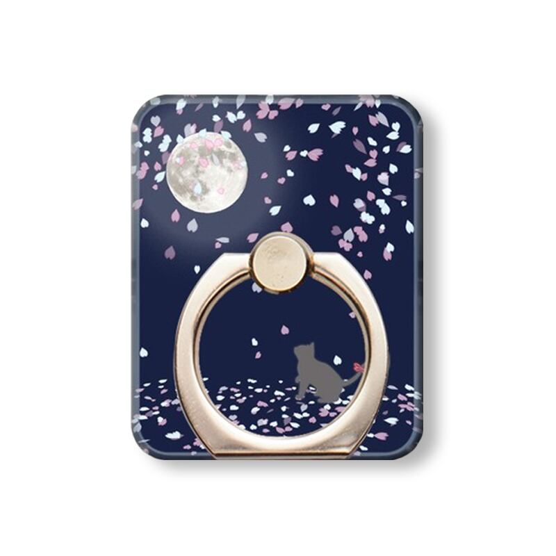 月夜に照らされる鮮やかな桜と猫を描いたスマホリングです。