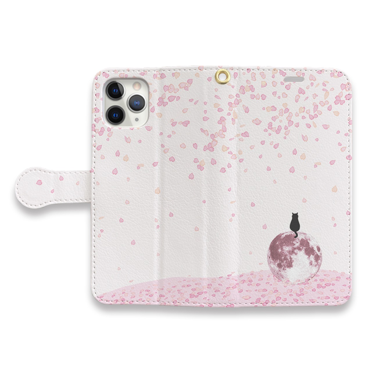 落ちた満月の上に乗り綺麗に桜舞い散る桜を眺める黒猫を描いた手帳型ケースです。